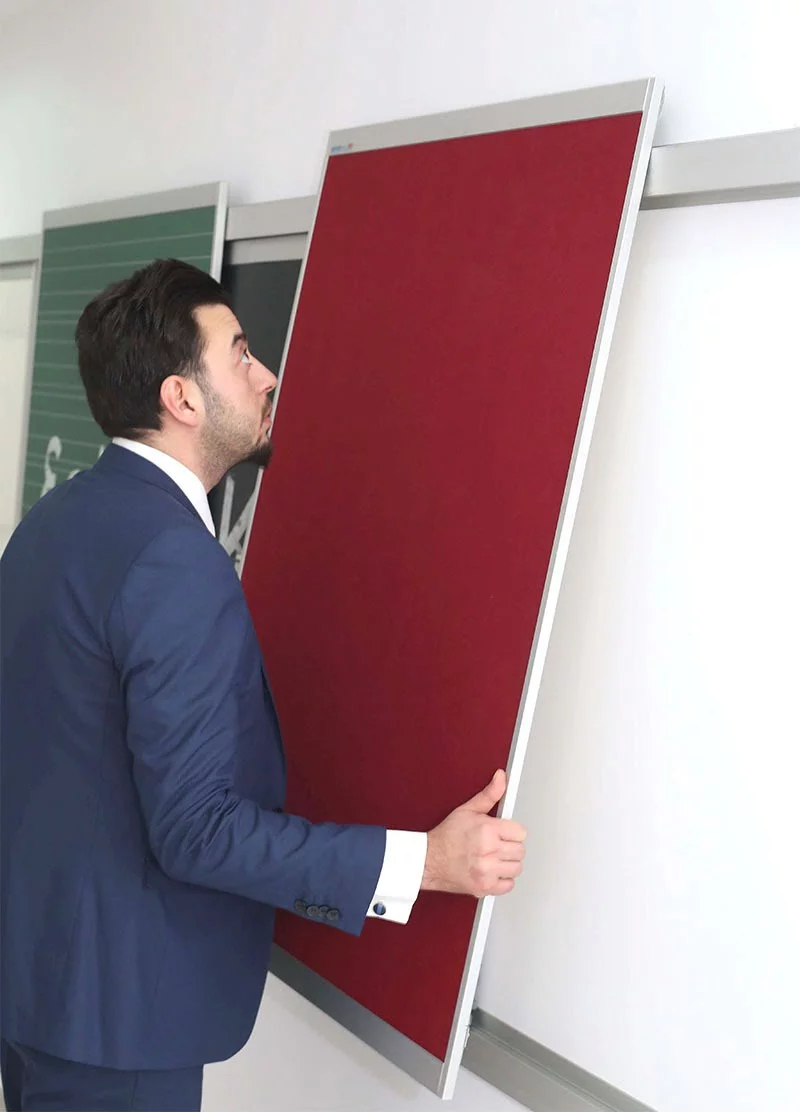 With the rail system, you can combine boards and pinboards with different surfaces as it is required in the class. You can position products of different sizes with three separate rails.